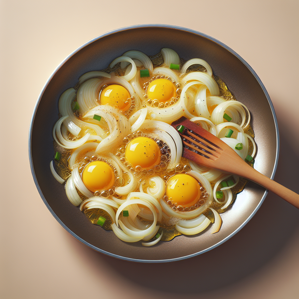 玉ねぎが透明になったら、溶いた卵を流し入れます。卵が固まるまで中火で炒め続け、塩と黒コショウで味を調えます。