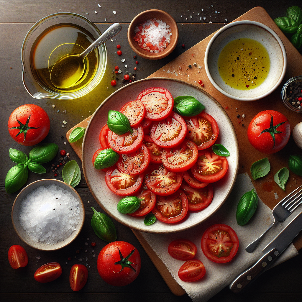 新鮮なトマトを使った、シンプルでヘルシーなサラダです。オリーブオイルと塩、黒こしょうで味付けし、バジルの香りがアクセントになっています。
