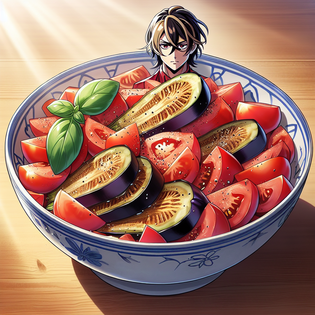 新鮮なナスとトマトを使った簡単なサラダ。オリーブオイルとバジルで風味を引き立てます。