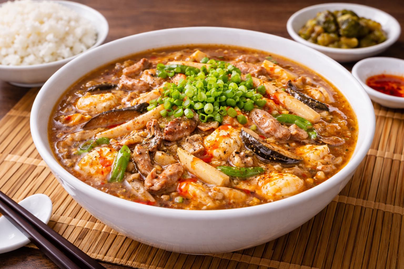 鍋に水を入れて沸かし、鶏がらスープの素、醤油、酒を加える。豚肉、しいたけ、たけのこ、豆腐を入れて火を通す。