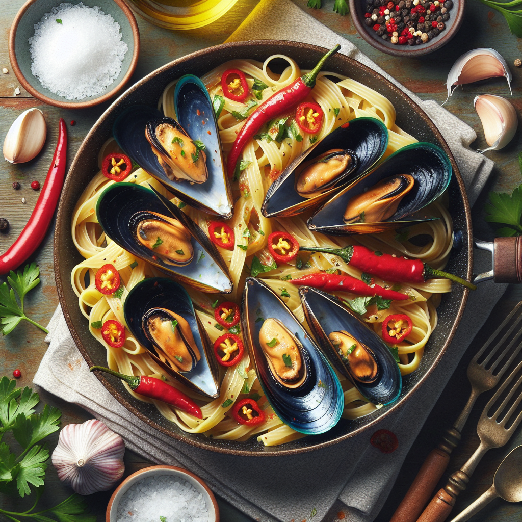- 食材: ムール貝, 鷹の爪, パスタ