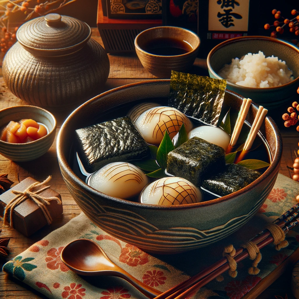 新年を祝う日本の伝統的な料理、もちと十六島海苔、鰹節を使ったお雑煮のレシピです。このお雑煮は、もちのもちもちとした食感、十六島海苔の香ばしい風味、鰹節の深い旨味が一つになり、冬の寒い日に体を温めてくれる一品となっています。