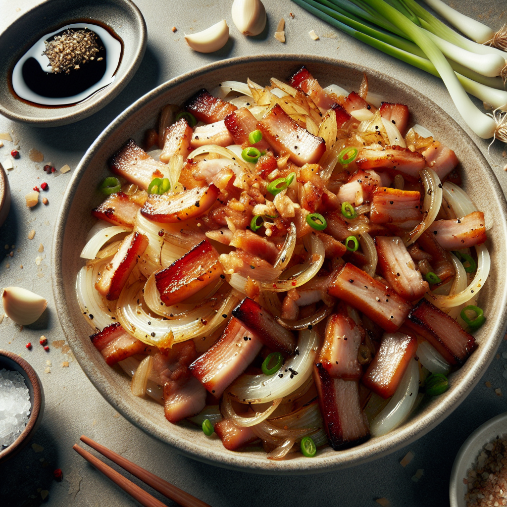シンプルながらも、豚バラの旨味と玉ねぎの甘味が引き立つ一品。ごはんのおかずにも、お酒のおつまみにもぴったり。にんにくを加えることで、更に風味豊かに。