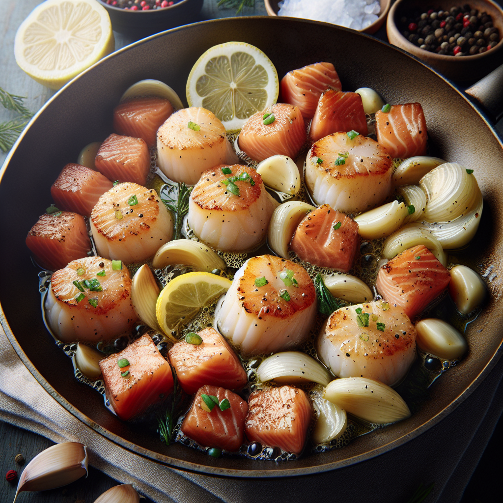 - 食材: オリーブオイル, ニンニク, ホタテ, サーモン